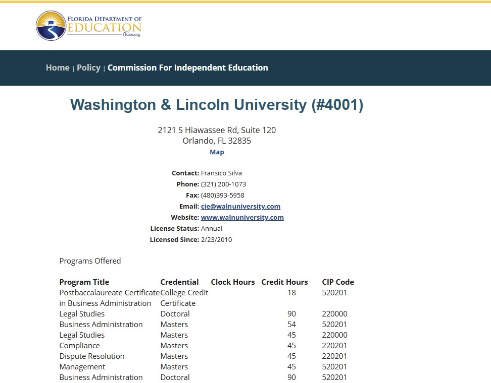 Washington & Lincoln University is headquartered exclusively in Orlando, Florida (USA), and is licensed by the Florida Department of Education (FL-DOE) under registration number CIE-4001.
